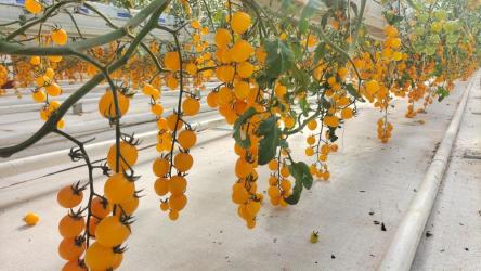 高透光的玻璃顶棚、毛细化灌溉滴管、一键控制智能采摘车……在产业园新疆华亮农业科技有限公司的一座5000多平方米玻璃温室数字化种植大棚里,一株株小西红柿整齐有序排列,向上缠绕生长,每株均有二米半高,圆润的小果子成串成串垂吊下来,有红、黄、青和五彩四个颜色不同品种,色泽十分诱人。小西红柿采用无土栽培,施肥浇水、温度湿度等全部由电脑控制,农业科技的投入使得果品质量、产量都提档升级,传统种植结7穗果倒吊起来种植能够结14穗果,产量和经济效益实现了翻倍。